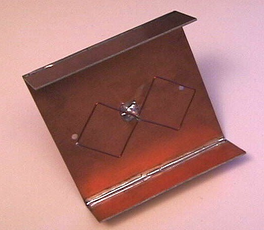 I used Printed Circuit board scraps for the 110 x 110 mm reflector, but it will be just as effective if made out of sheet brass or copper. Aluminum can be used if soldering of the rigid coax is not required at the feed point. The reflector's 'lips' are 30 mm high, and serve to reduce coupling into the mounting bar. Note that they are only required along the main edge axis of the reflector. The lips cut down radiation from the rear lobes of the biquad by about 6 dB The best SWR is obtained when the biquad loop is about 15mm above the ground plane, and the SWR may be adjusted by varying this distance. If you are making a stand-alone antenna, rather than a feed, you will get better gain from a reflector 123 x 123 mm |