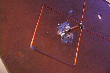 The rigid 0.141 diameter coax is soldered to the groundplane to provide physical support for the structure. If the biquad element is constructed carefully there will be no component of radiation along the axis of the coax, no current is induced into the coax outer conductor, and a balun is not needed. An SMA connector can be seen on the end of the rigid coax used to support the biquad element |