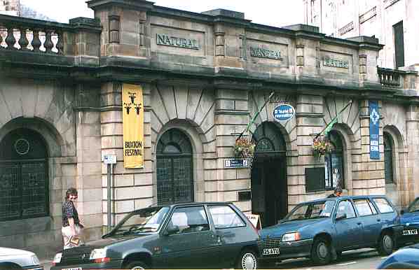 Click on the thumnail for a larger view (27K) of the Baths which comprise the major reason Buxton exists. The source of the healing waters, shown here, has been turned into a tourist information bureau, while the hospital at which so many patients were treated lies practically unused. It was said that Gilbert himself was prescribed a visit to the Buxton baths to cure his gout.